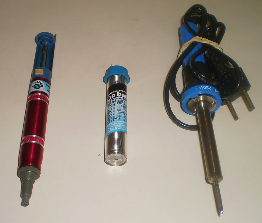 8 - Ferro de solda, estanho e sugador para reparos e trocas de componentes eletrônicos.