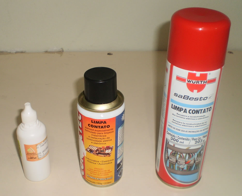 11 - Álcool isopropílico e limpa contato para limpeza de placas e componentes eletrônicos. O álcool é usado geralmente para remoção de pasta térmica ressecada do processador.