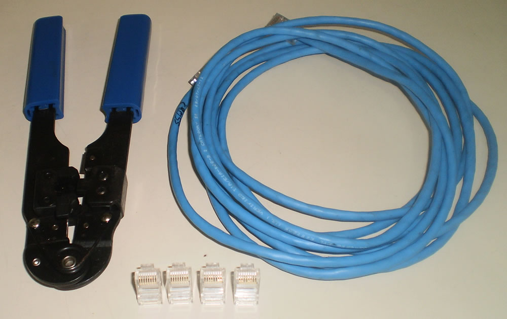 10 - Alicate de crimpar, cabo e conector RJ45 para montagem de redes cabeadas.